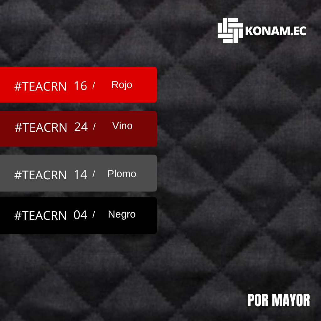 Tela acolchada de nylon con diseño de rombos, relleno de plumón y tafeta forrada internamente, que brinda abrigo, suavidad y confort. Fabricada en 100% nylon, es repelente al agua y resistente, ideal para prendas térmicas y de protección contra el frío. Disponible en varios colores al por mayor y menor en Grupo Konam.