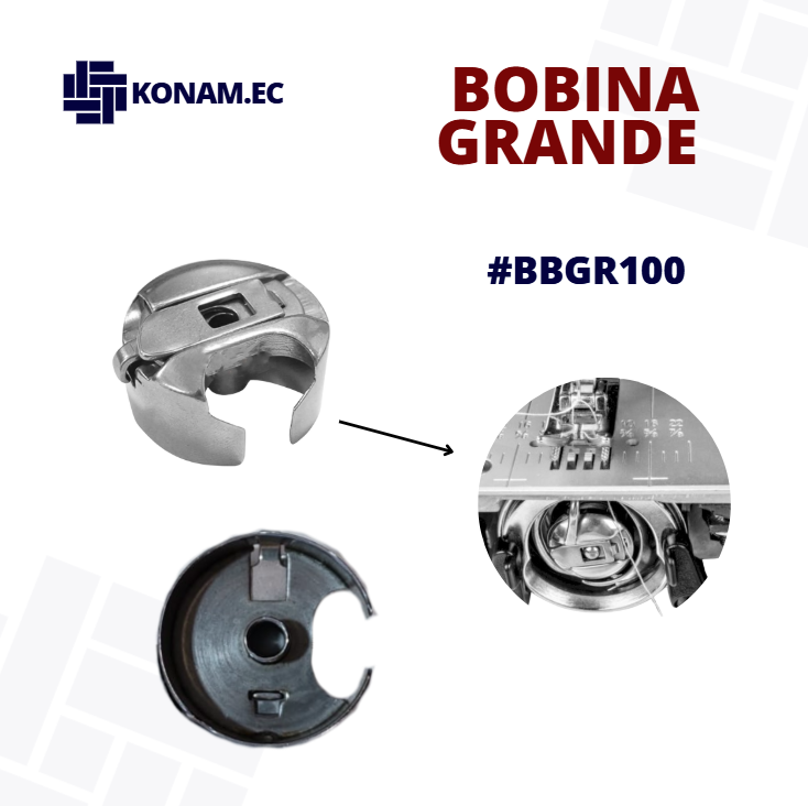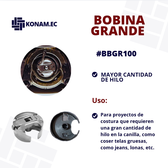 Bobina grande, diseñada para ofrecer mayor capacidad de hilo, ideal para trabajos de costura continuos sin interrupciones. Permite cargar más hilo en la canilla, optimizando el rendimiento en máquinas de coser y mejorando la eficiencia en proyectos exigentes.