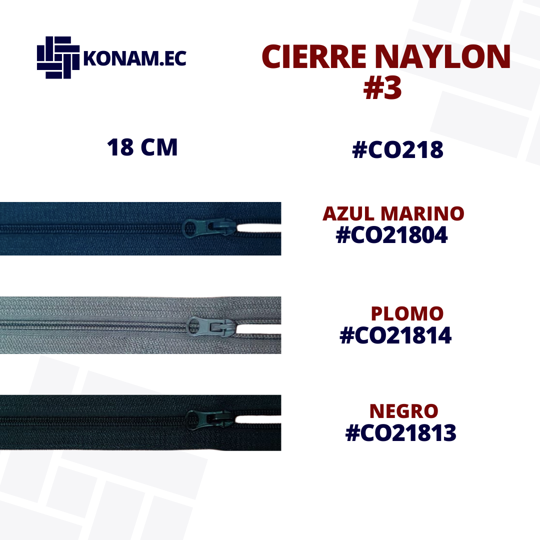 Cierre de Nylon #3 de 18 cm aprox., ligero y flexible, ideal para confecciones que requieren un cierre suave, resistente y de fácil manejo, especialmente en prendas livianas.