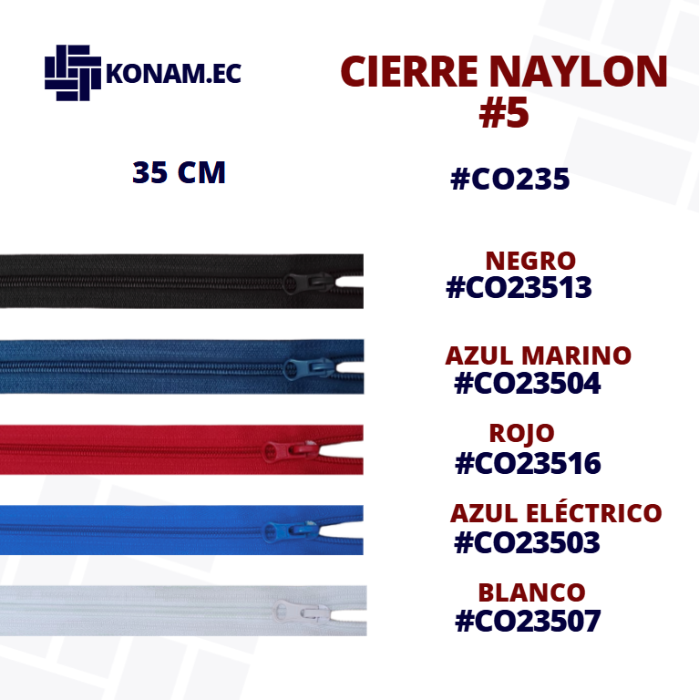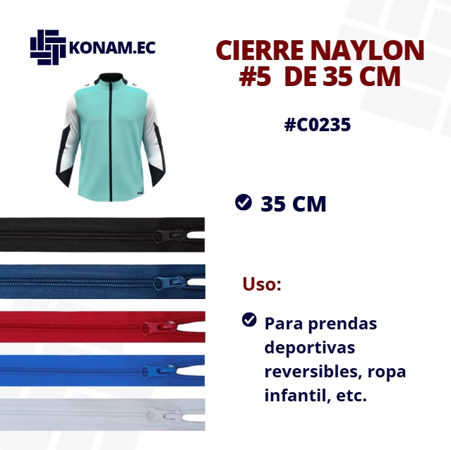 Cierre Nylon #5 de 35 cm aprox., ligero y flexible, ideal para confecciones que requieren un cierre suave, resistente y de fácil manejo, especialmente en prendas livianas.
