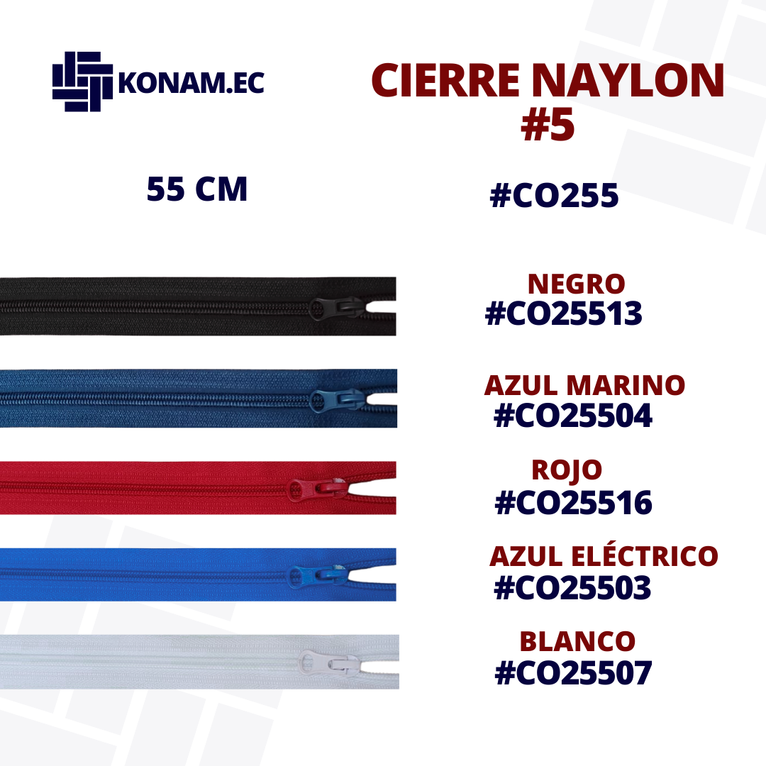 Cierre Nylon #5 de 55 cm aprox., ligero y flexible, ideal para confecciones que requieren un cierre suave, resistente y de fácil manejo, especialmente en prendas livianas.