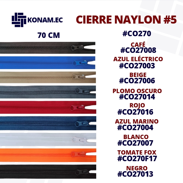 Cierre Nylon #5 de 70 cm aprox., ligero y flexible, ideal para confecciones que requieren un cierre suave, resistente y de fácil manejo, especialmente en prendas livianas.