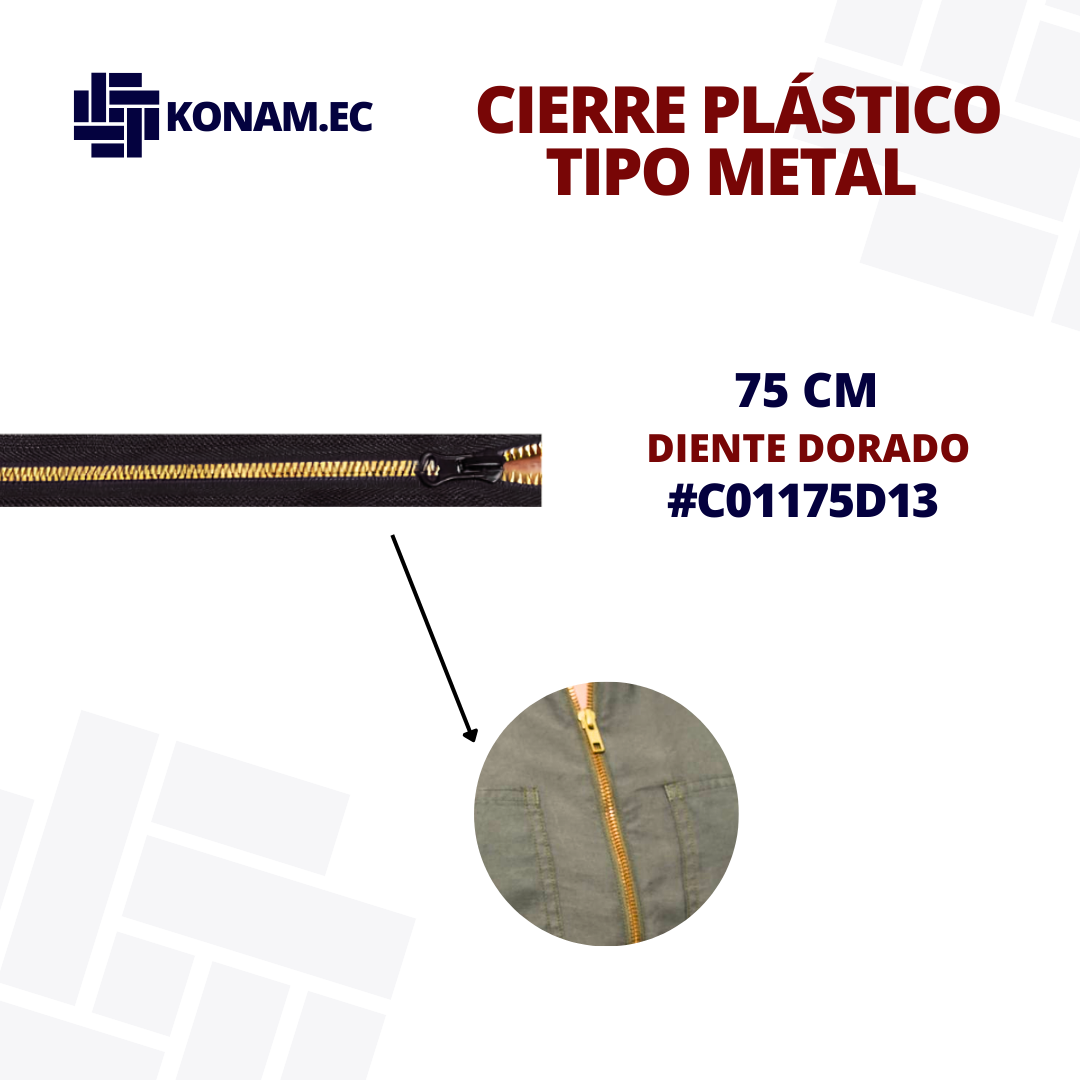 Cierre plástico tipo metal de diente dorado de 75 cm aprox., combina ligereza y resistencia con un acabado estético tipo metálico, ideal para confecciones que buscan funcionalidad y buena presentación.