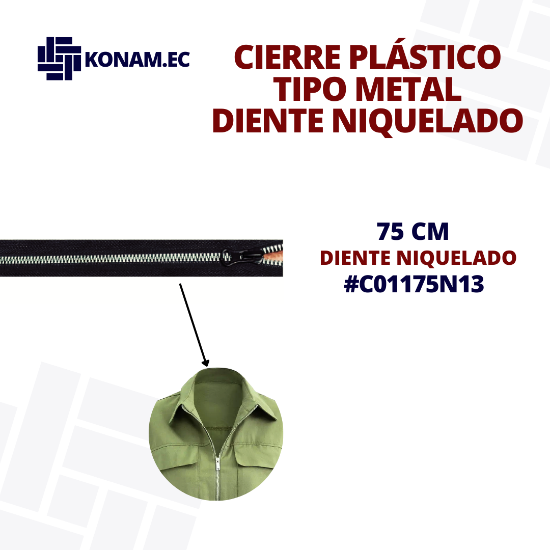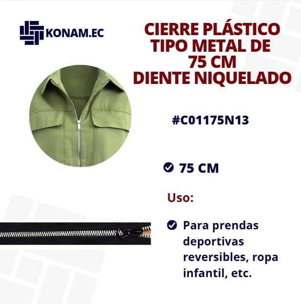 Cierre plástico tipo metal de diente niquelado de 75 cm aprox., combina ligereza y resistencia con un acabado estético tipo metálico, ideal para confecciones que buscan funcionalidad y buena presentación.