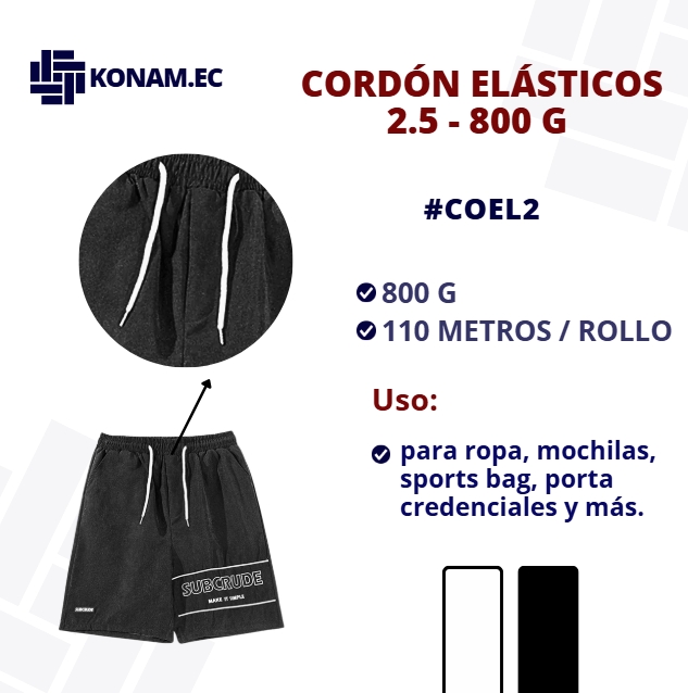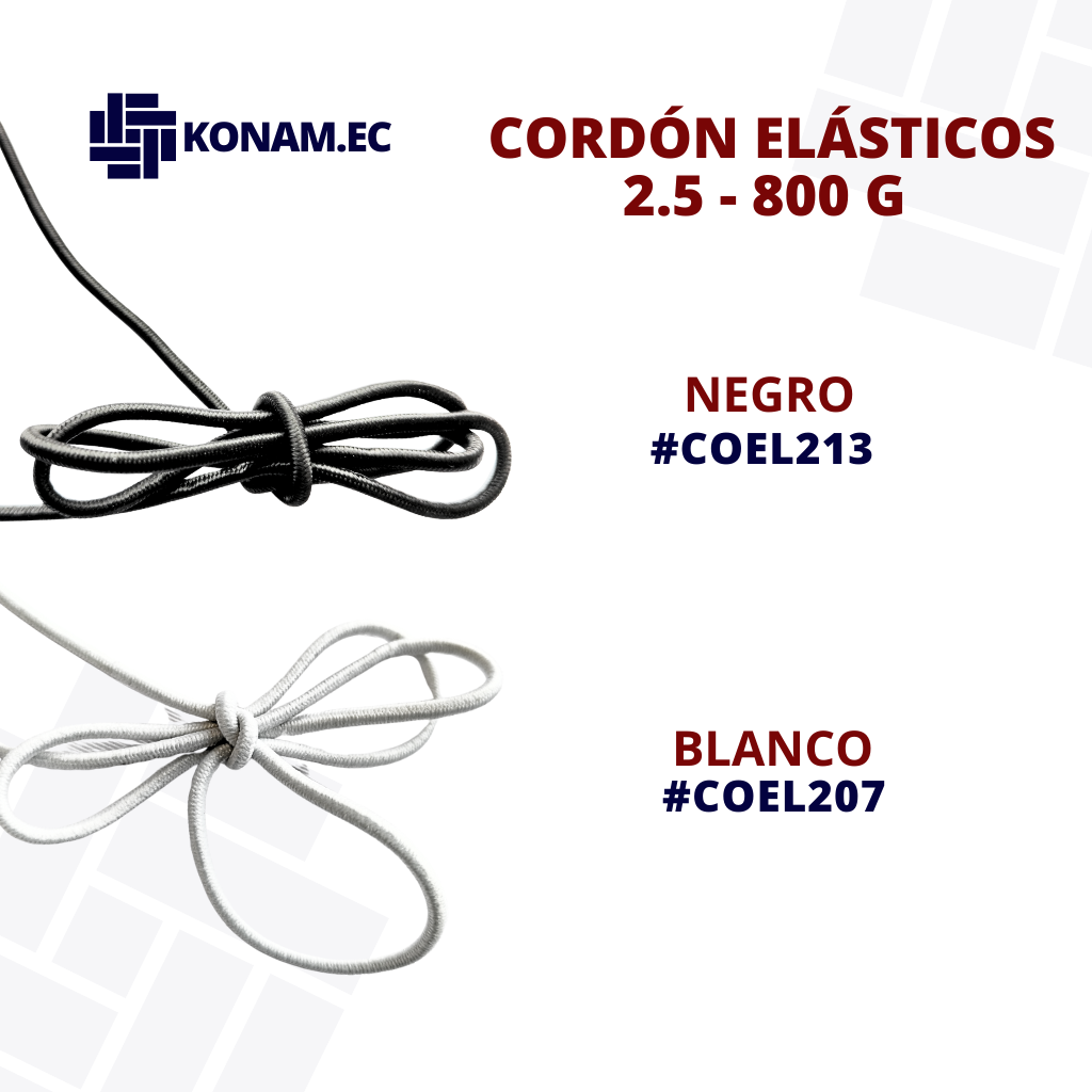Cordón elástico de 2.5 mm de grosor aprox., presentación de 800 g aprox., flexible y resistente, ideal para ajustes seguros y cómodos en diferentes tipos de confección. Producto identificado con código #COEL2, se vende por kilos y cuenta con un rendimiento aproximado de 110 metros por rollo aprox.