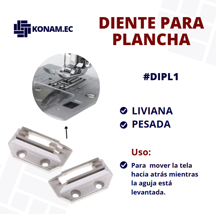 Diente para plancha, disponible en versión liviana y pesada, diseñado para mover la tela hacia atrás mientras la aguja está levantada, arrastrando el material de forma uniforme para formar la puntada. Permite un avance preciso del tejido, mejorando la regularidad y calidad de la costura.