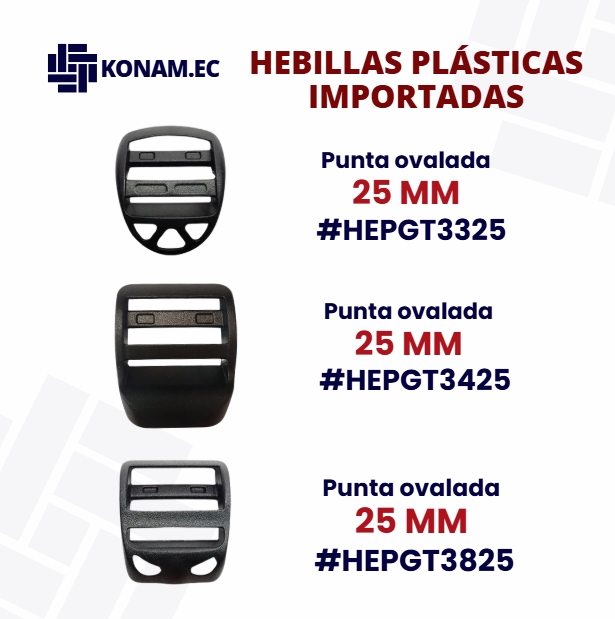 Hebillas nacionales e importadas fabricadas en plástico resistente, disponibles en varios modelos y colores. Son ideales para confección gracias a su durabilidad y facilidad de uso. Se venden por cientos, convirtiéndolas en una opción práctica y económica para productores de mochilas, bolsos, maletas y prendas.