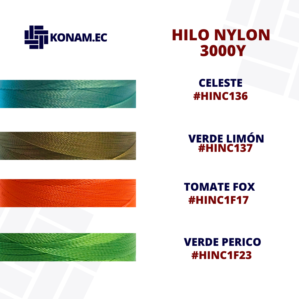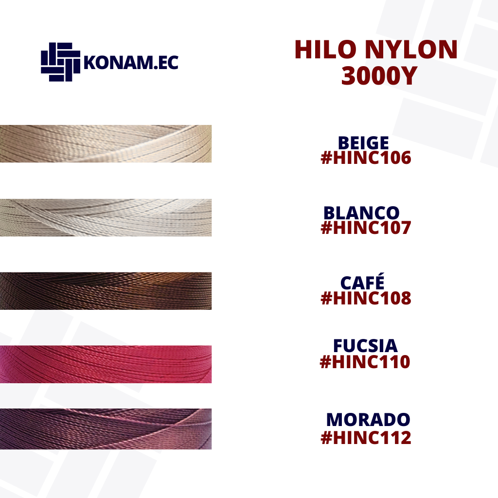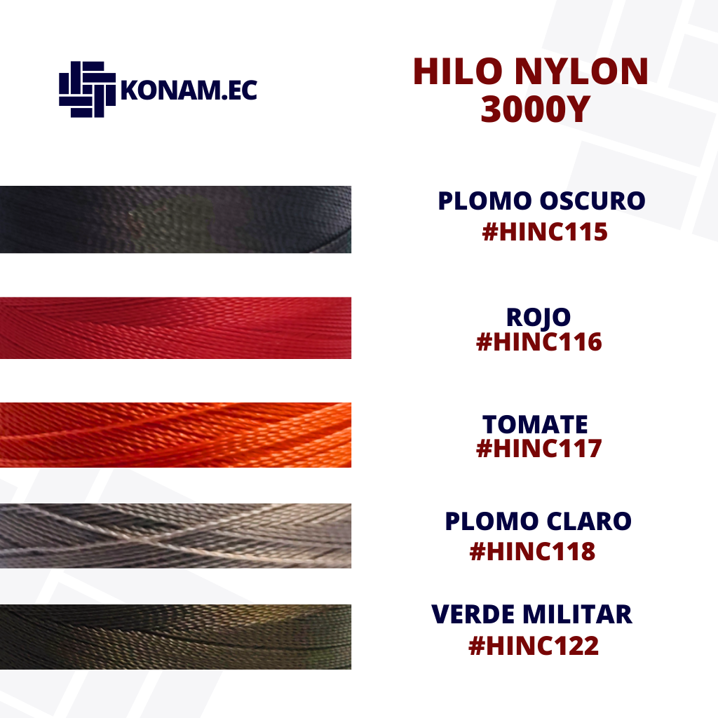 Hilo de Nylon de 3,000 yardas #HINC en una amplia gama de colores, ideal para costura resistente y duradera en confección de maletería y accesorios de uso intenso.