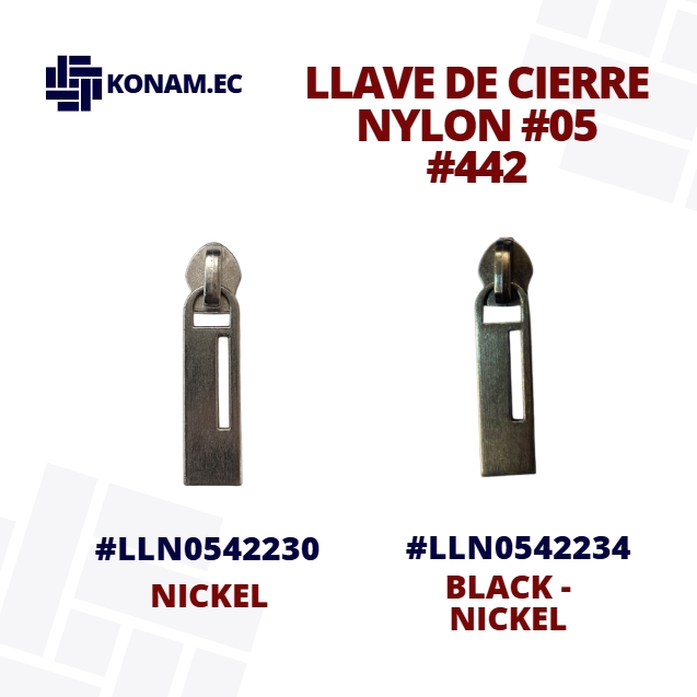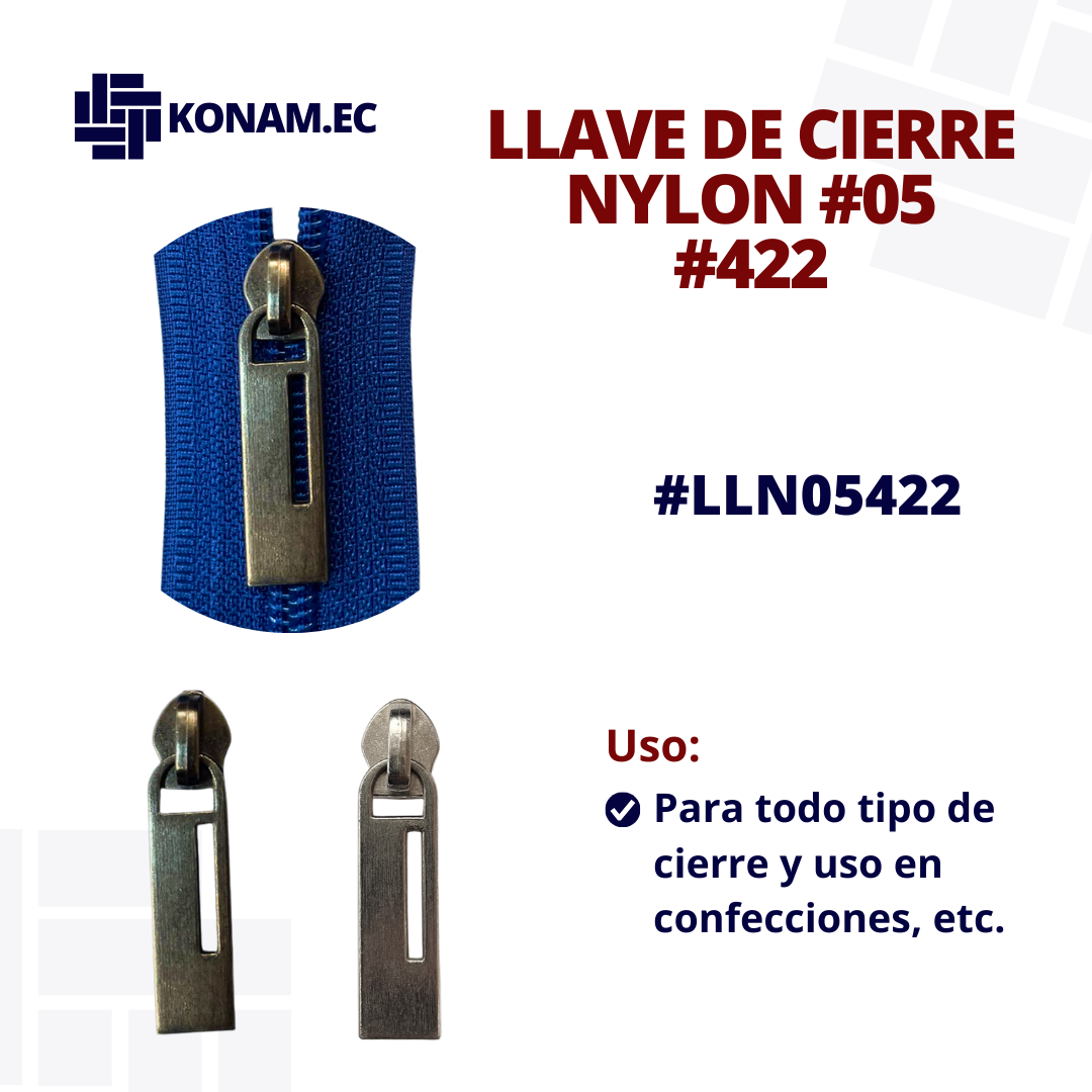 Llave de cierre Nylon #05 modelo 422, resistente y de excelente acabado, diseñada para brindar un deslizamiento suave y seguro en todo tipo de cierres. Su fabricación de calidad garantiza durabilidad y buen rendimiento en diferentes confecciones.