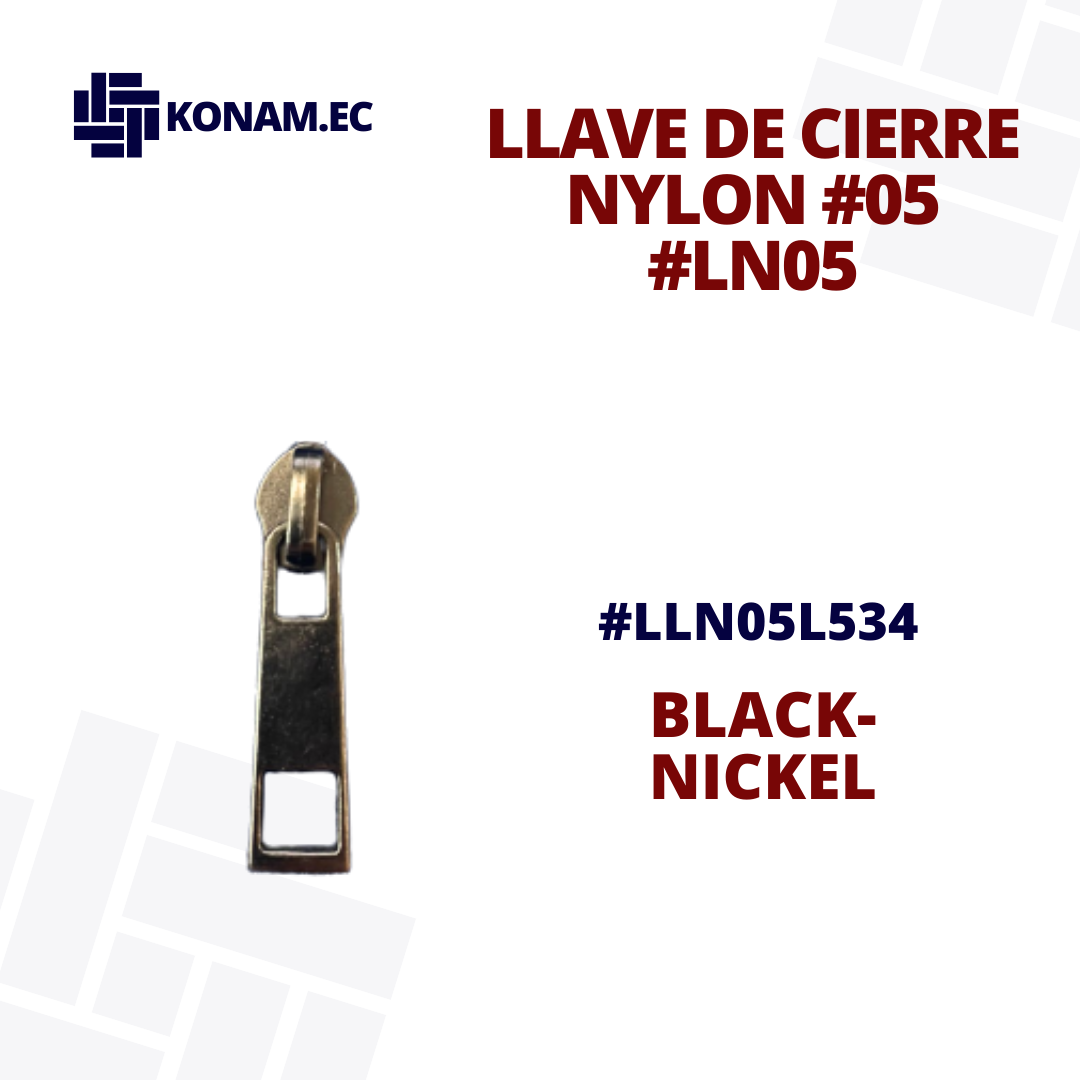 Llave de cierre Nylon #05 modelo #LN05 con acabado black nickel, resistente y de excelente acabado que proporciona un deslizamiento suave y seguro. Su diseño moderno con apariencia metálica oscura aporta estilo y durabilidad a todo tipo de cierres en confecciones.