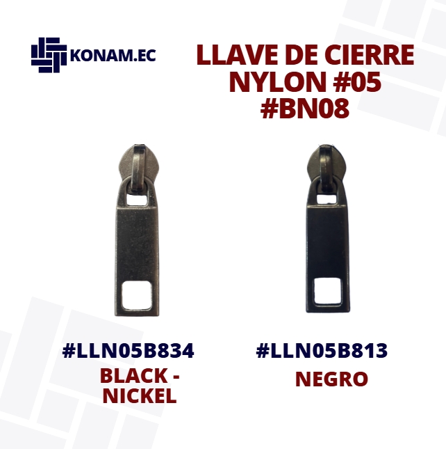 Llave de cierre Nylon #05 modelo BN08, resistente y de excelente acabado, diseñada para brindar un deslizamiento suave y seguro en todo tipo de cierres. Su fabricación de calidad garantiza durabilidad y buen rendimiento en diferentes confecciones.