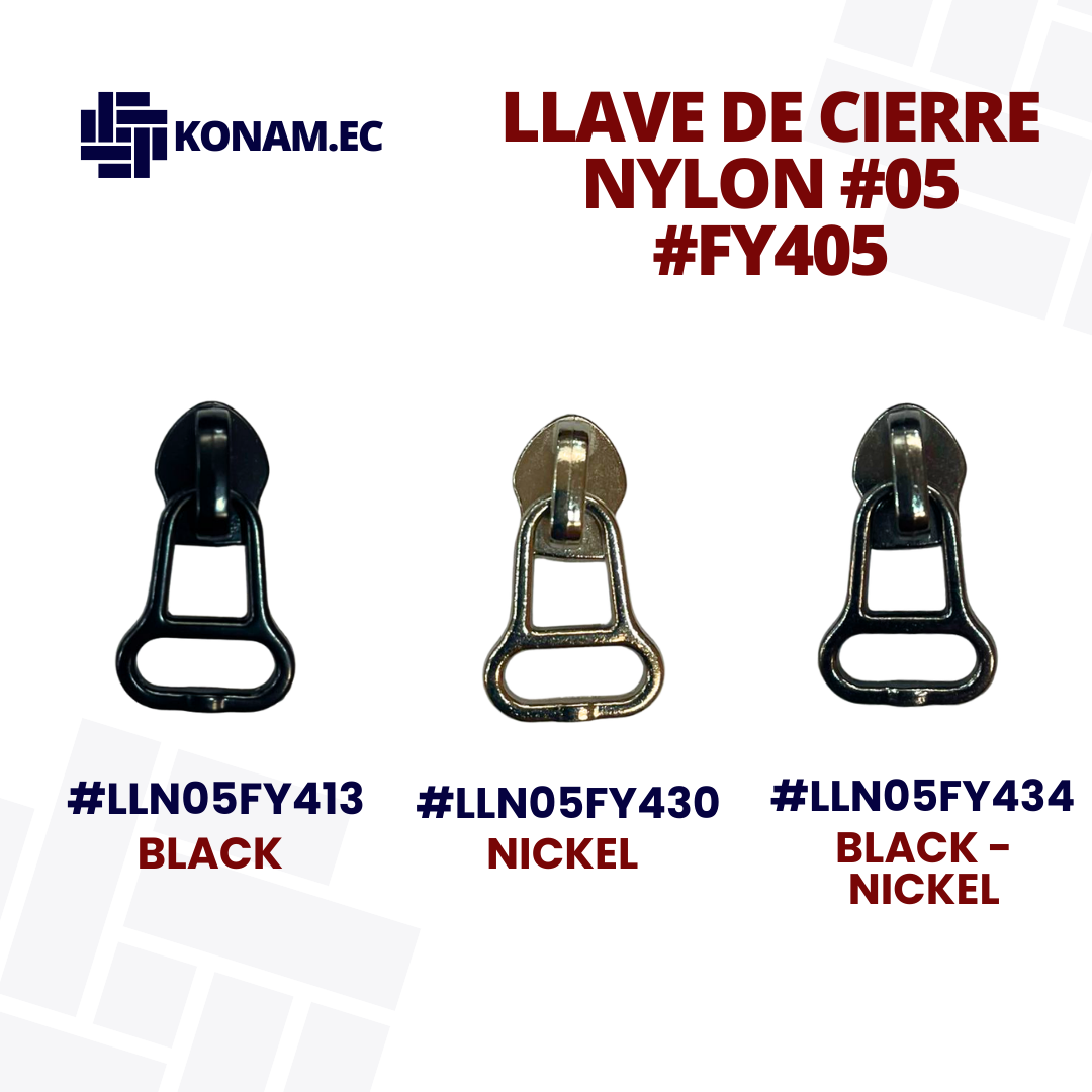 Llave de cierre Nylon #05 modelo FY405, resistente y duradera, ideal para todo tipo de cierres en confecciones. Fabricada con excelente acabado que garantiza un deslizamiento suave y seguro, brindando mayor funcionalidad y larga vida útil en cada prenda.