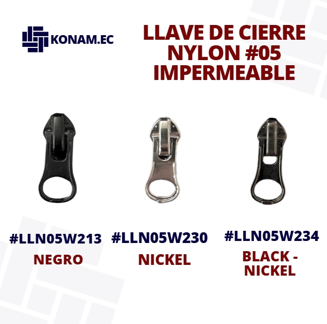 Llave de cierre Nylon #05 impermeable, diseñada para ofrecer mayor protección contra la humedad y un deslizamiento suave en todo tipo de cierres. Fabricada con materiales resistentes y de excelente acabado que garantizan durabilidad y buen funcionamiento en diferentes confecciones.