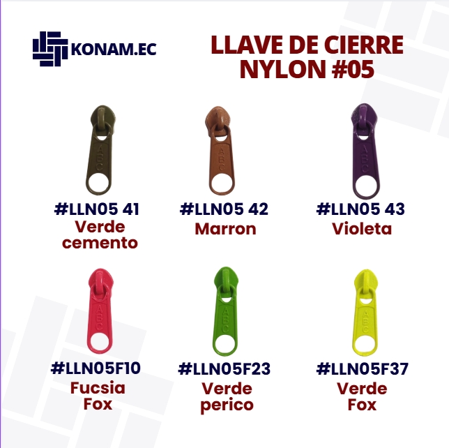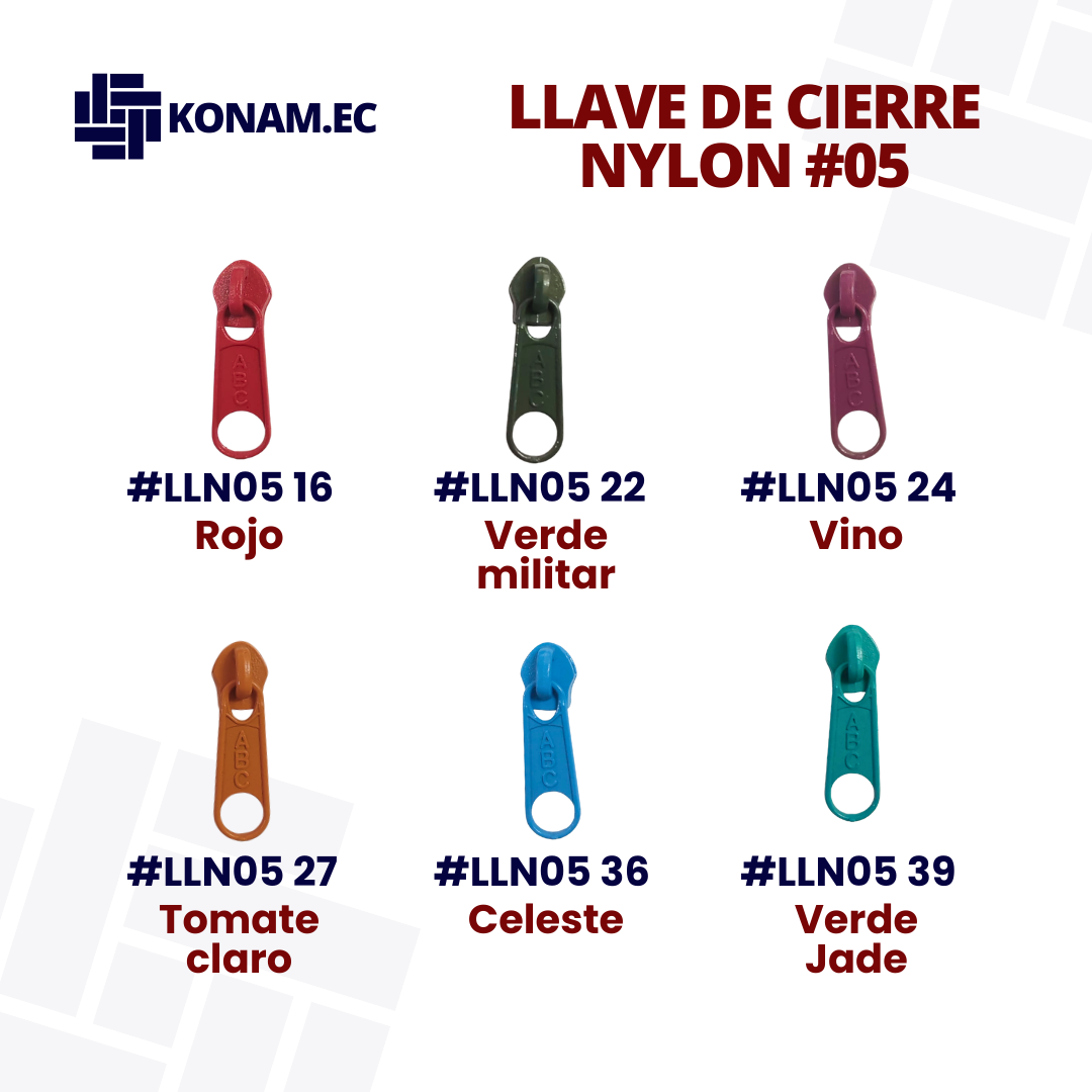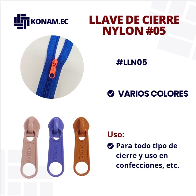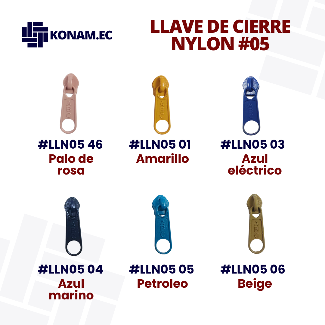 Llave de cierre en nylon #05, disponible en varios colores, resistente y de fácil deslizamiento, ideal para complementar cierres en diferentes tipos de confección. Producto identificado con código #LLN05, práctico y funcional para múltiples aplicaciones.