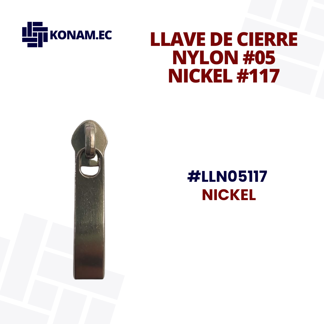 Llave de cierre nylon #05, modelo nickel #117, resistente y de excelente acabado, diseñada para un deslizamiento suave y seguro en diferentes tipos de confección. Su material niquelado aporta mayor durabilidad y una presentación profesional. Producto identificado con código #LLN05117.