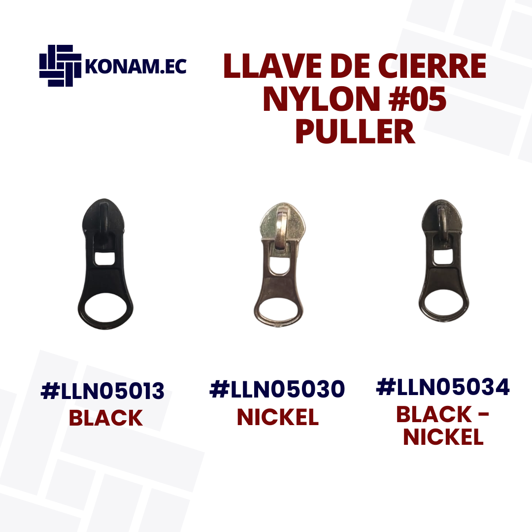 Llave de cierre nylon #05 tipo puller, diseñada para brindar un agarre cómodo y un deslizamiento suave en todo tipo de cierres. Resistente y funcional, es ideal para confecciones que requieren practicidad y durabilidad. Producto identificado con código #LLN050.