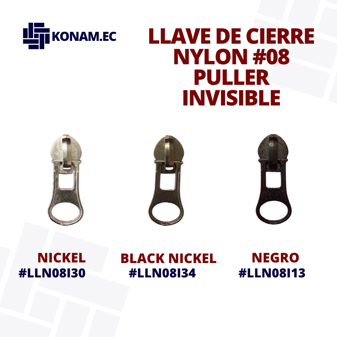 Llave de cierre Nylon #08 modelo PULLER INVISIBLE, resistente y de excelente acabado, diseñada para brindar un deslizamiento suave y seguro en todo tipo de cierres. Su fabricación de calidad garantiza durabilidad y buen rendimiento en diferentes confecciones.