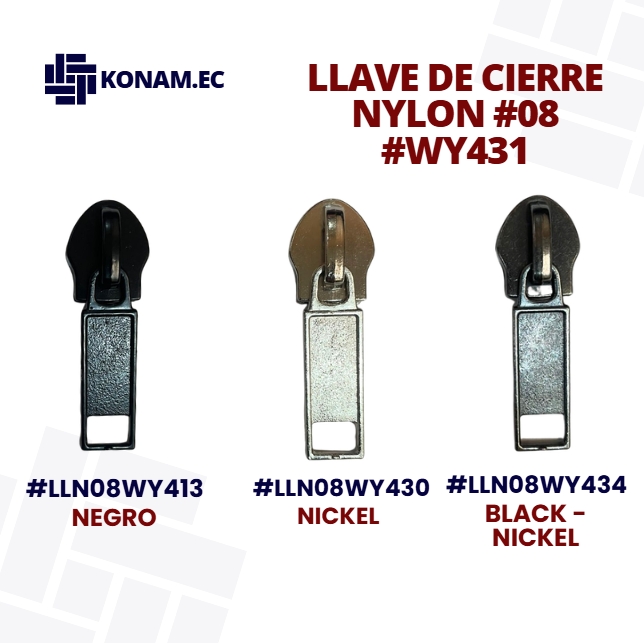 Llave de cierre Nylon #08 modelo WY431, resistente y funcional, diseñada para brindar un deslizamiento suave y seguro. Su excelente acabado asegura durabilidad y rendimiento óptimo en todo tipo de cierres para confecciones.