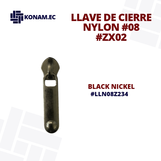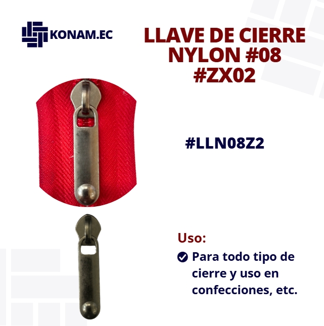Llave de cierre Nylon #08 modelo ZX02 , resistente y de excelente acabado, diseñada para brindar un deslizamiento suave y seguro en todo tipo de cierres. Su fabricación de calidad garantiza durabilidad y buen rendimiento en diferentes confecciones.