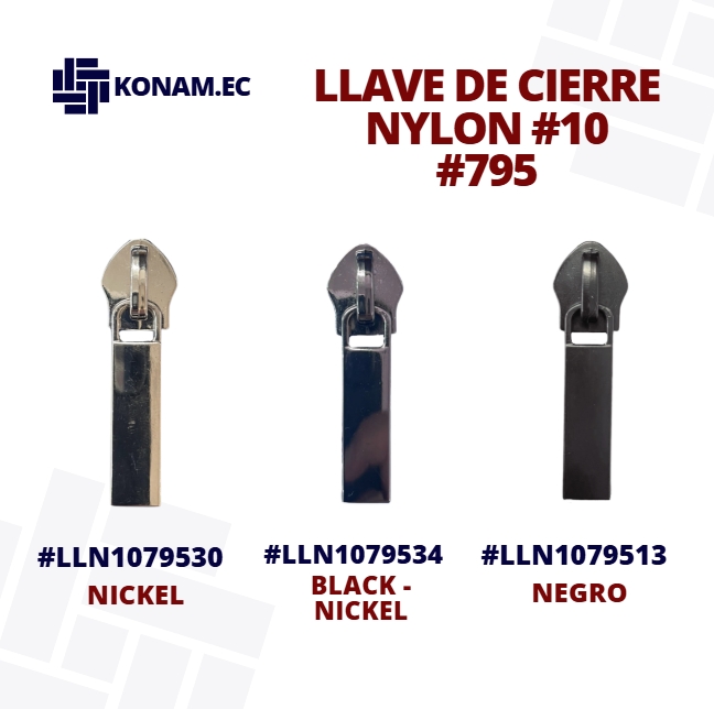 Llave de cierre Nylon #10 modelo 795, de alta resistencia y excelente acabado, diseñada para ofrecer un deslizamiento firme y seguro en cierres de mayor tamaño. Su fabricación robusta garantiza durabilidad y óptimo rendimiento en aplicaciones exigentes.