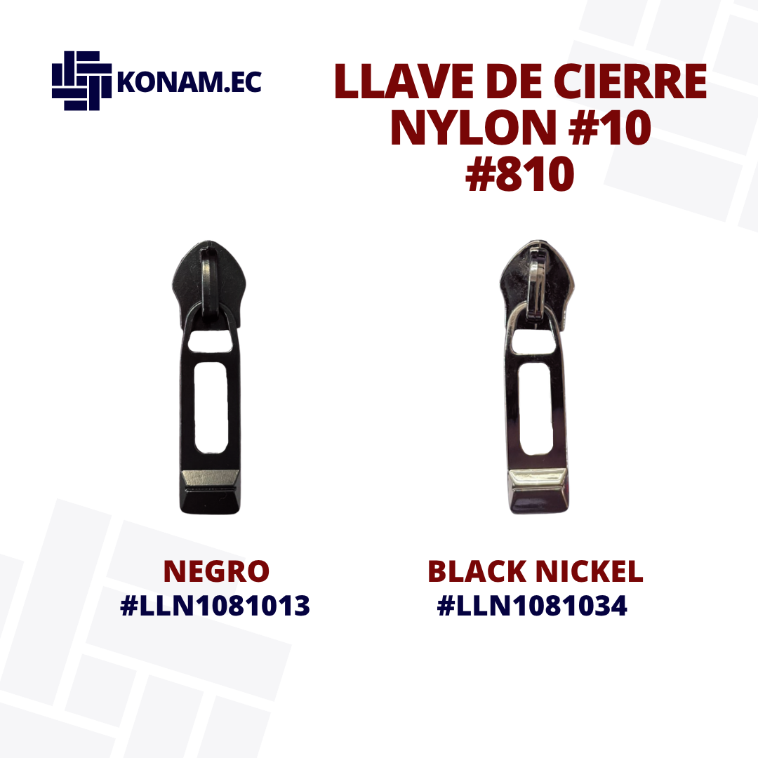 Llave de cierre Nylon #10 modelo 810, de alta resistencia y excelente acabado, diseñada para ofrecer un deslizamiento firme y seguro en cierres de mayor tamaño. Su fabricación robusta garantiza durabilidad y óptimo rendimiento en aplicaciones exigentes.