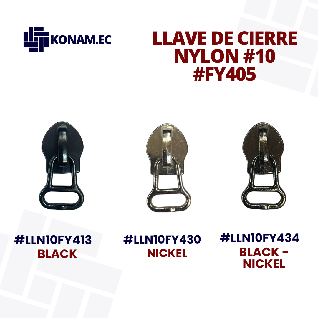 Llave de cierre Nylon #10 modelo FY405, resistente y duradera, ideal para todo tipo de cierres en confecciones. Fabricada con excelente acabado que garantiza un deslizamiento suave y seguro, brindando mayor funcionalidad y larga vida útil en cada prenda.