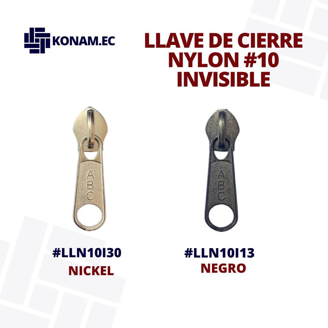 Llave de cierre Nylon #10 modelo Invisible, de alta resistencia y excelente acabado, diseñada para ofrecer un deslizamiento firme y seguro en cierres de mayor tamaño. Su fabricación robusta garantiza durabilidad y óptimo rendimiento en aplicaciones exigentes.