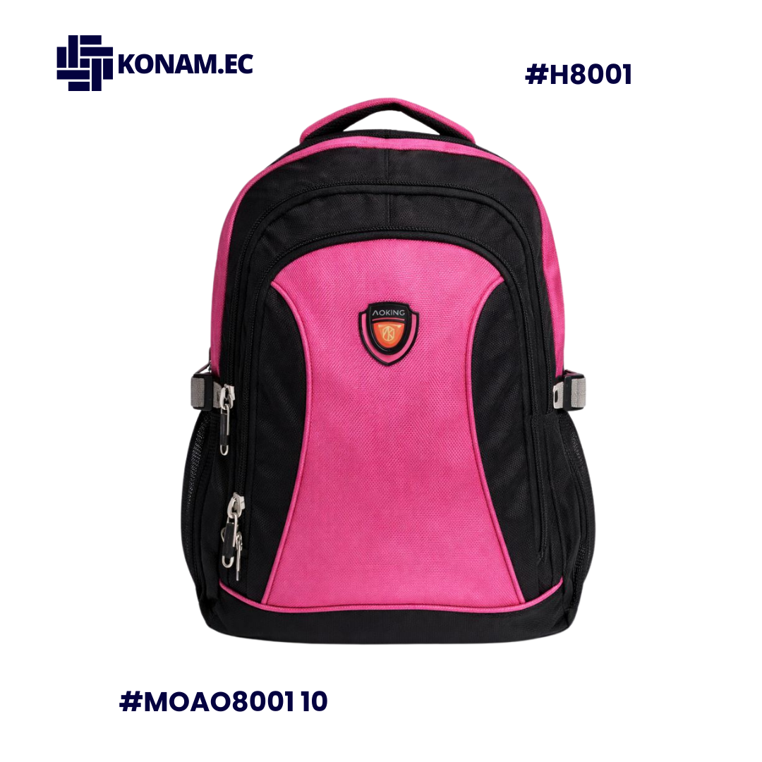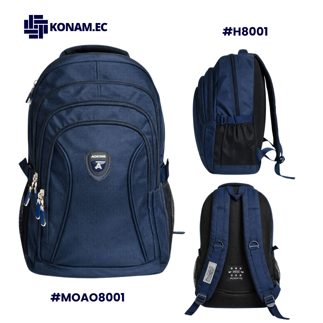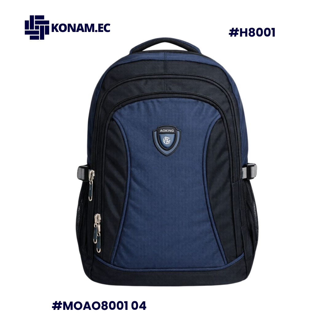 Mochila importada Aoking Serie H8001, de gran capacidad y diseño ergonómico que garantiza comodidad y funcionalidad. Fabricada con poliéster tipo lona o cordura impermeable en la parte externa y forro interno 100% poliéster, ofrece resistencia y durabilidad en todo entorno. Cuenta con llaves bidireccionales de nailon y bolsillos laterales de malla ideales para botellas o accesorios. Sus dimensiones son 48 x 32 x 18 cm, con ligeras variaciones por medición manual.