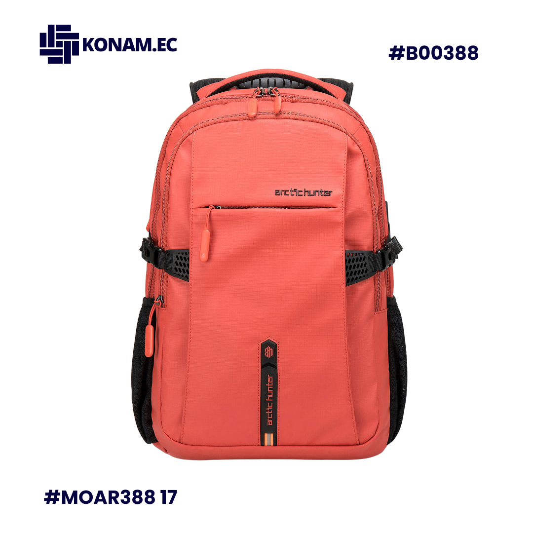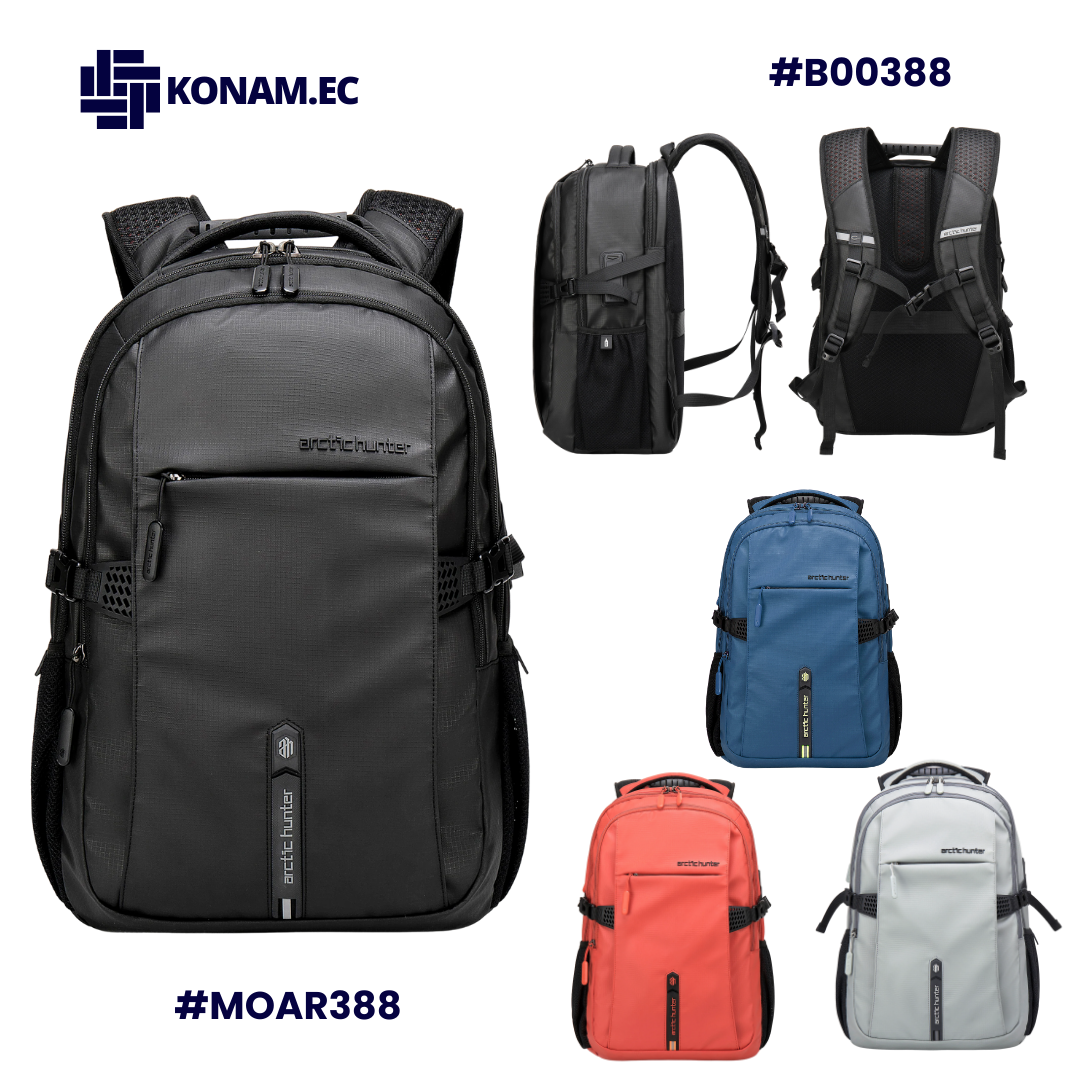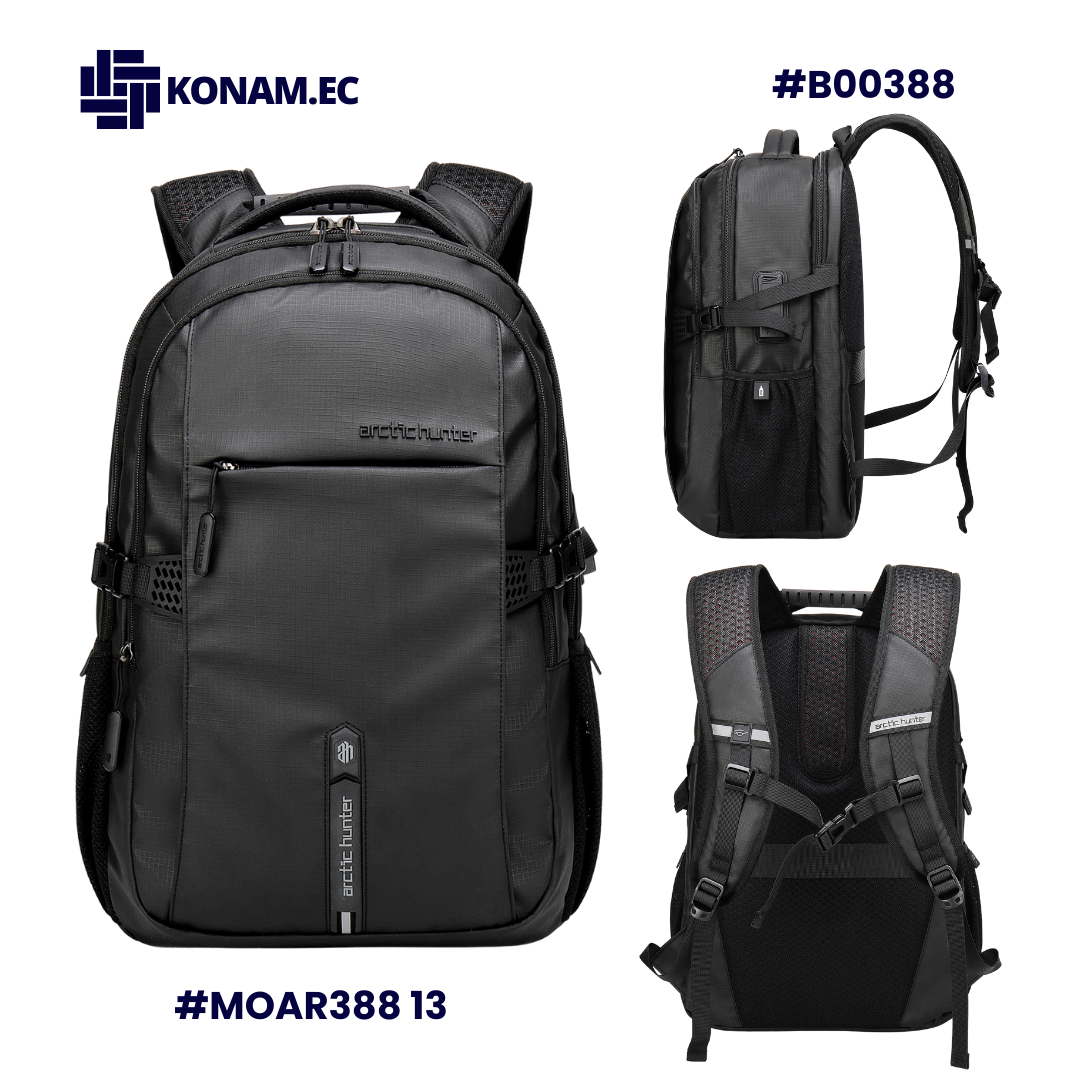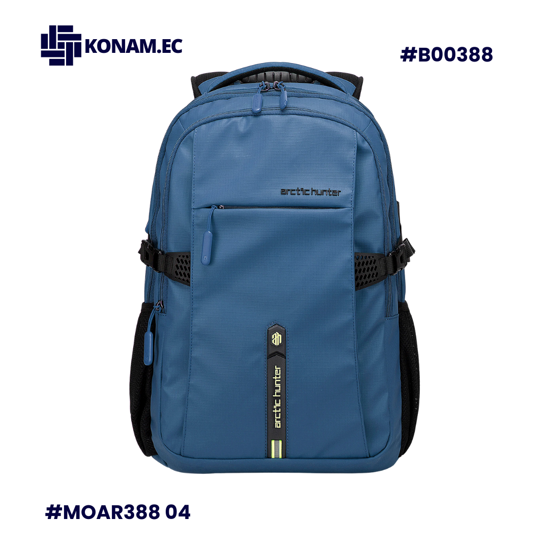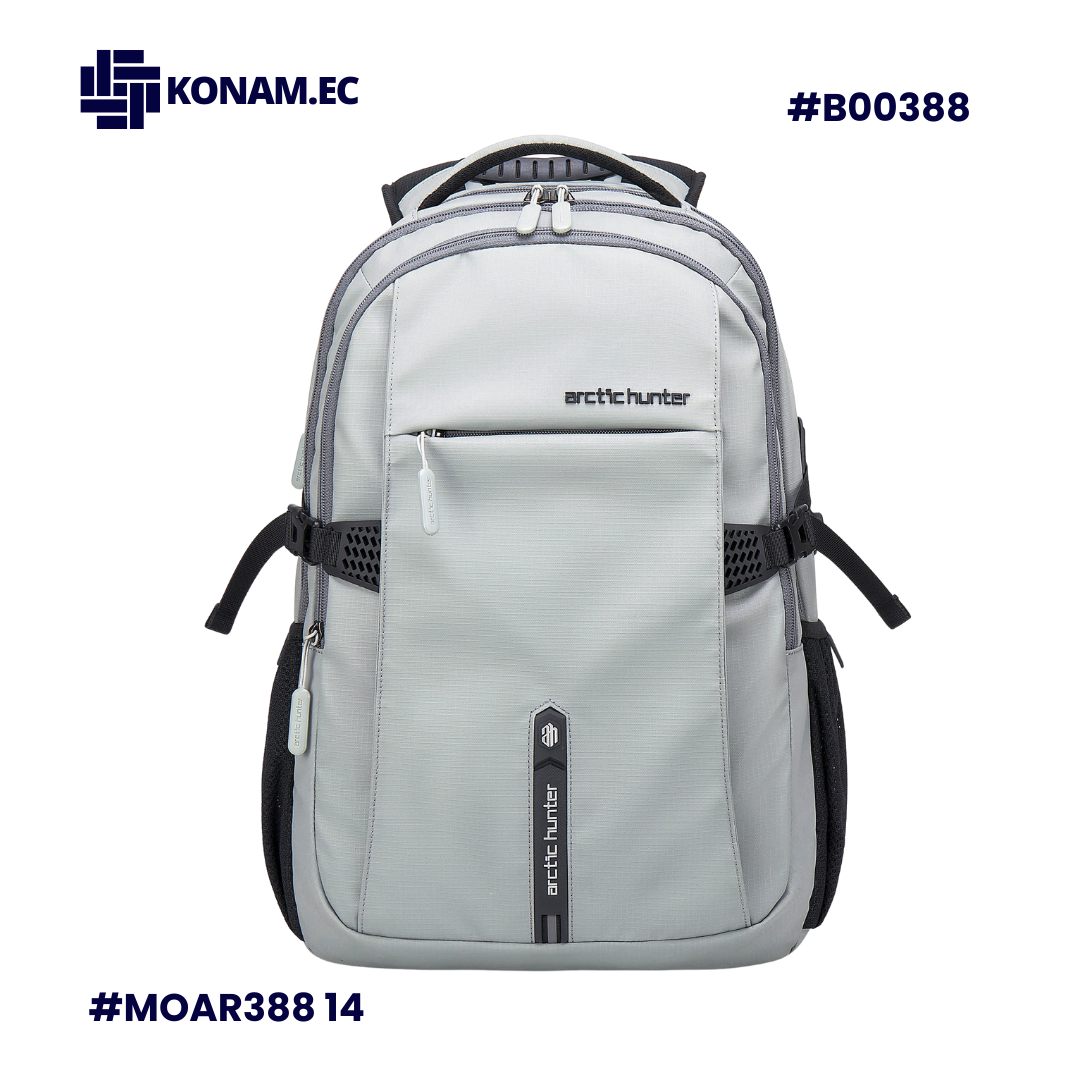 Mochila ARCTIC HUNTER B00388, impermeable y funcional, diseñada para uso universitario y diario. Fabricada en poliéster resistente, cuenta con espacio para laptop de hasta 15.6”, dimensiones de 46 × 30 × 21 cm aprox., capacidad de 30 L aprox. y peso de 0.90 kg aprox., ofreciendo comodidad, protección y excelente organización.