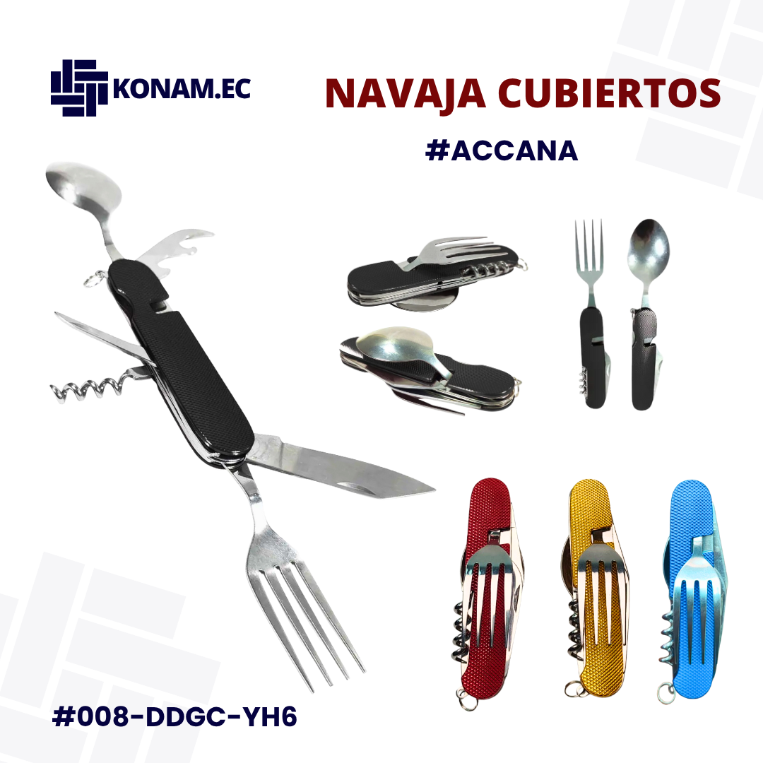 Navaja cubiertos desprendible #008-DDGC-YH6 #ACCANA tipo 7 en 1, práctica, ligera y multifuncional. Fabricada en acero inoxidable de grado alimenticio, combina resistencia, higiene y durabilidad. Su mango de plástico reforzado reduce el peso y mejora el agarre, mientras que su diseño desmontable permite separar las piezas para usar cuchara, tenedor y cuchillo simultáneamente. Compacta y fácil de transportar, ideal para actividades al aire libre o uso diario.