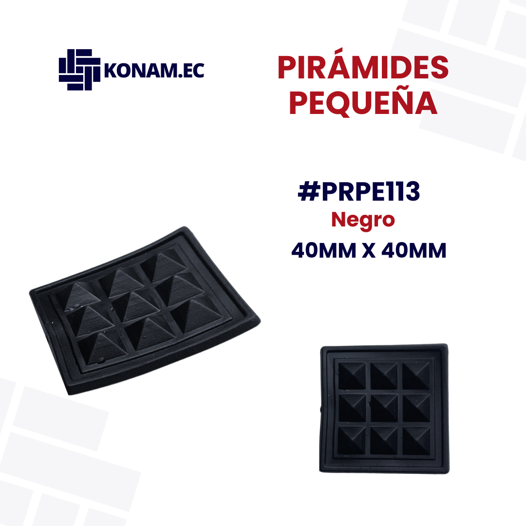 Pirámide plástica pequeña, resistente y práctica, ideal para aplicaciones en confección de accesorios. Su tamaño de 40 mm x 40 mm aprox. y su color negro ofrecen un acabado discreto y funcional, adaptándose fácilmente a distintos diseños y materiales.