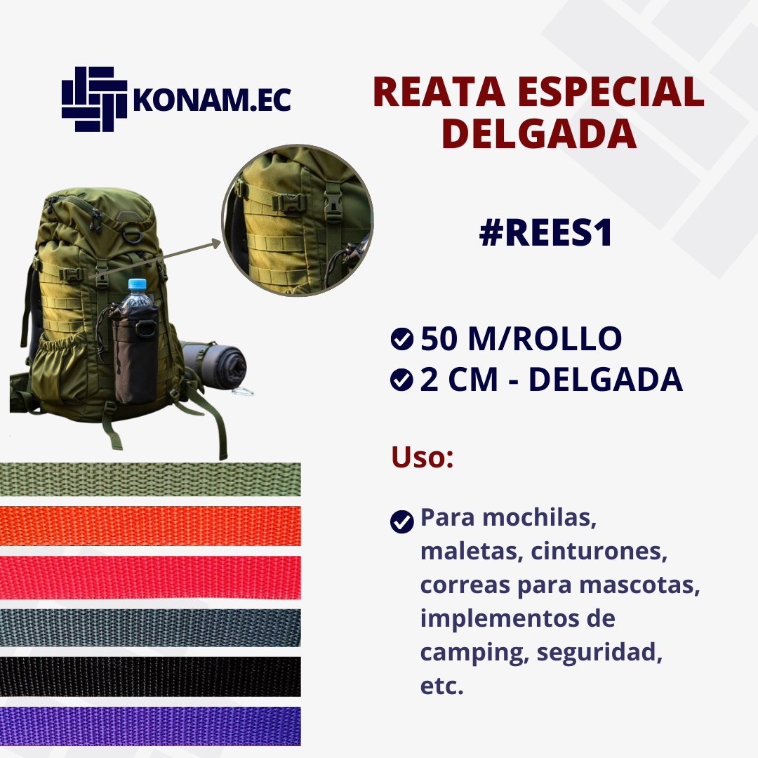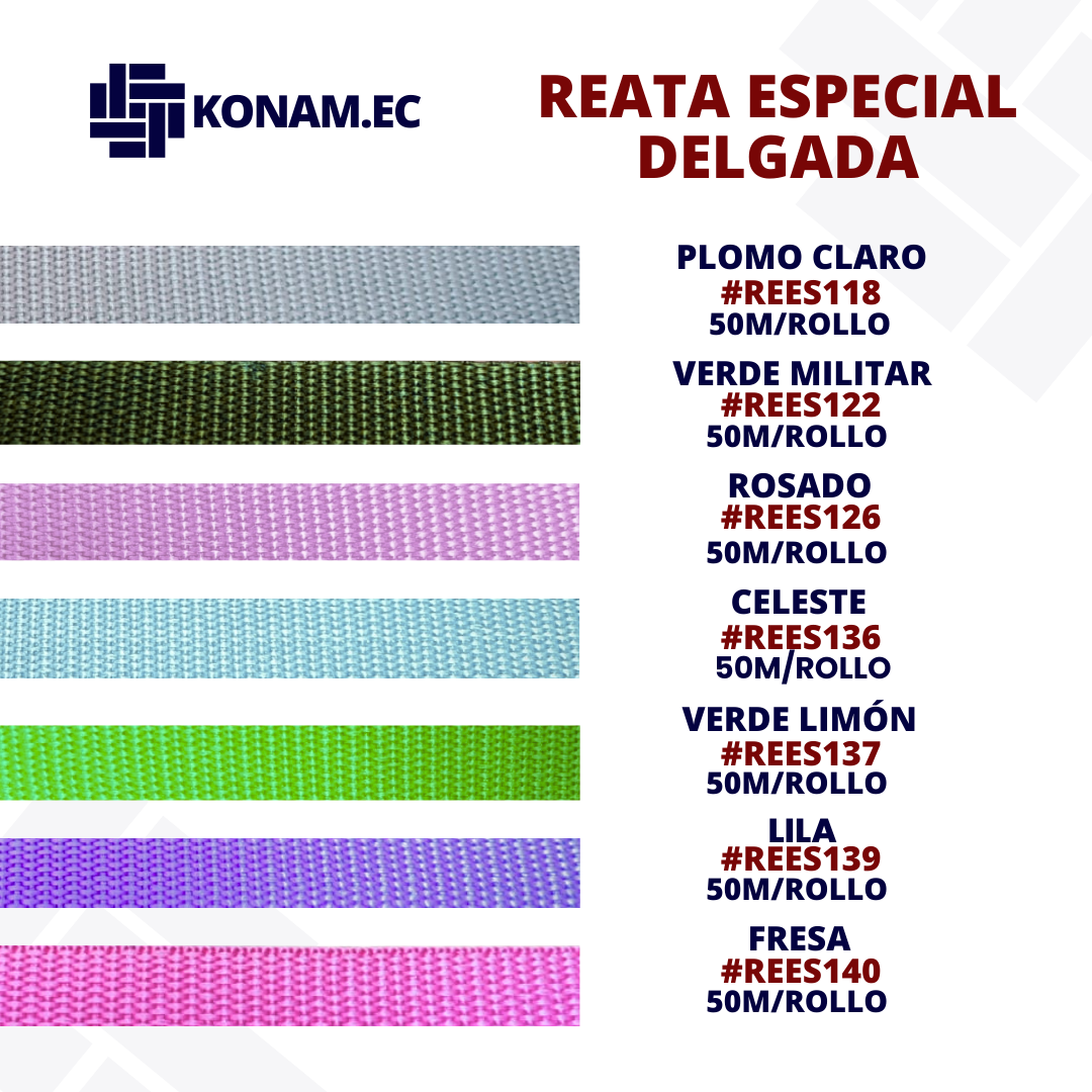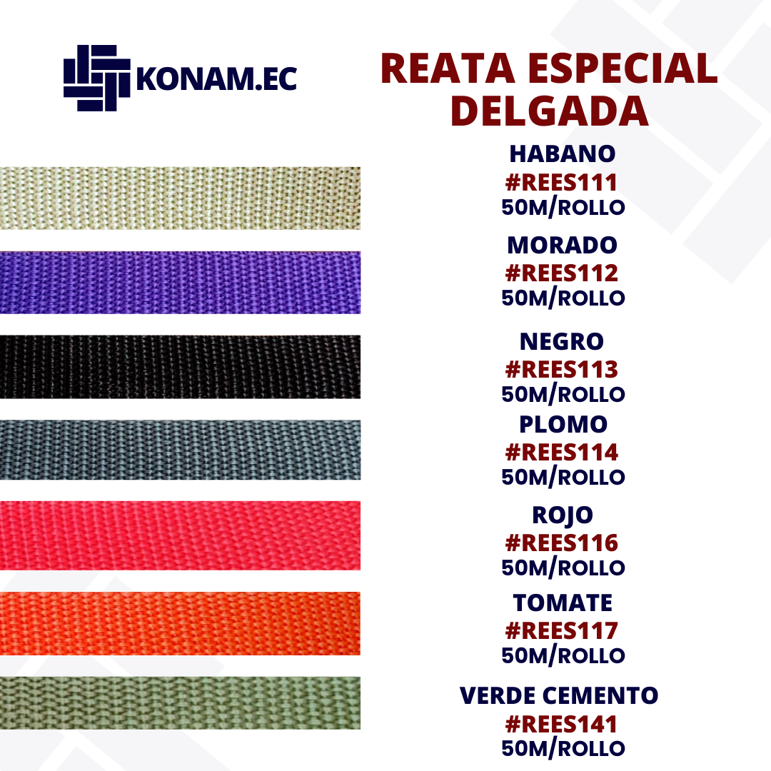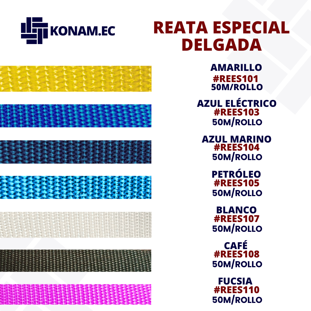 Reata especial delgada de 2 cm aprox., presentada en rollo de 50 m/rollo aprox., fabricada con material de alta resistencia y durabilidad. Su estructura firme ofrece excelente soporte y desempeño confiable en aplicaciones que requieren mayor seguridad y resistencia al uso continuo.