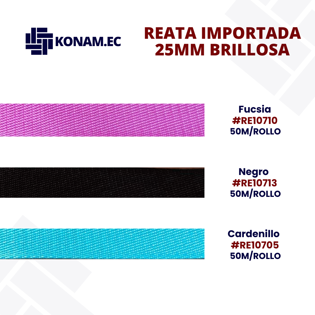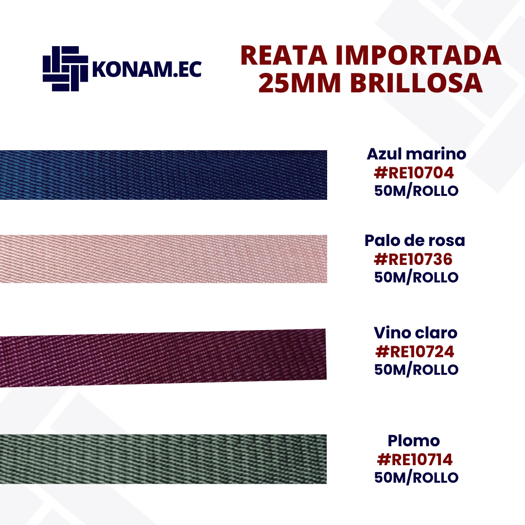 Reata importada brillosa de 25 mm aprox., presentación en rollo de 50 m aprox., con acabado liso y atractivo que aporta resistencia y una excelente apariencia visual, ideal para confecciones funcionales con mejor presentación.