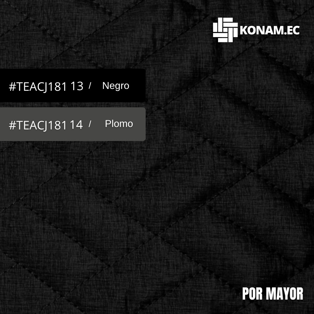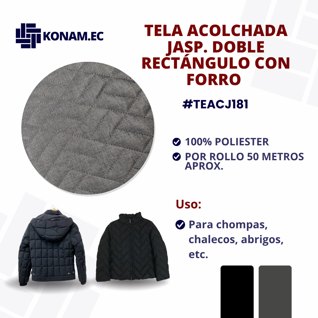 Tela acolchada jaspeada con diseño de doble rectángulo y forro interno, fabricada en 100% poliéster. Su estructura acolchada aporta volumen, calidez y una textura suave, ofreciendo aislamiento térmico y resistencia para confecciones modernas y funcionales. Es un material ligero, durable y versátil, ideal para prendas exteriores con acabado profesional.