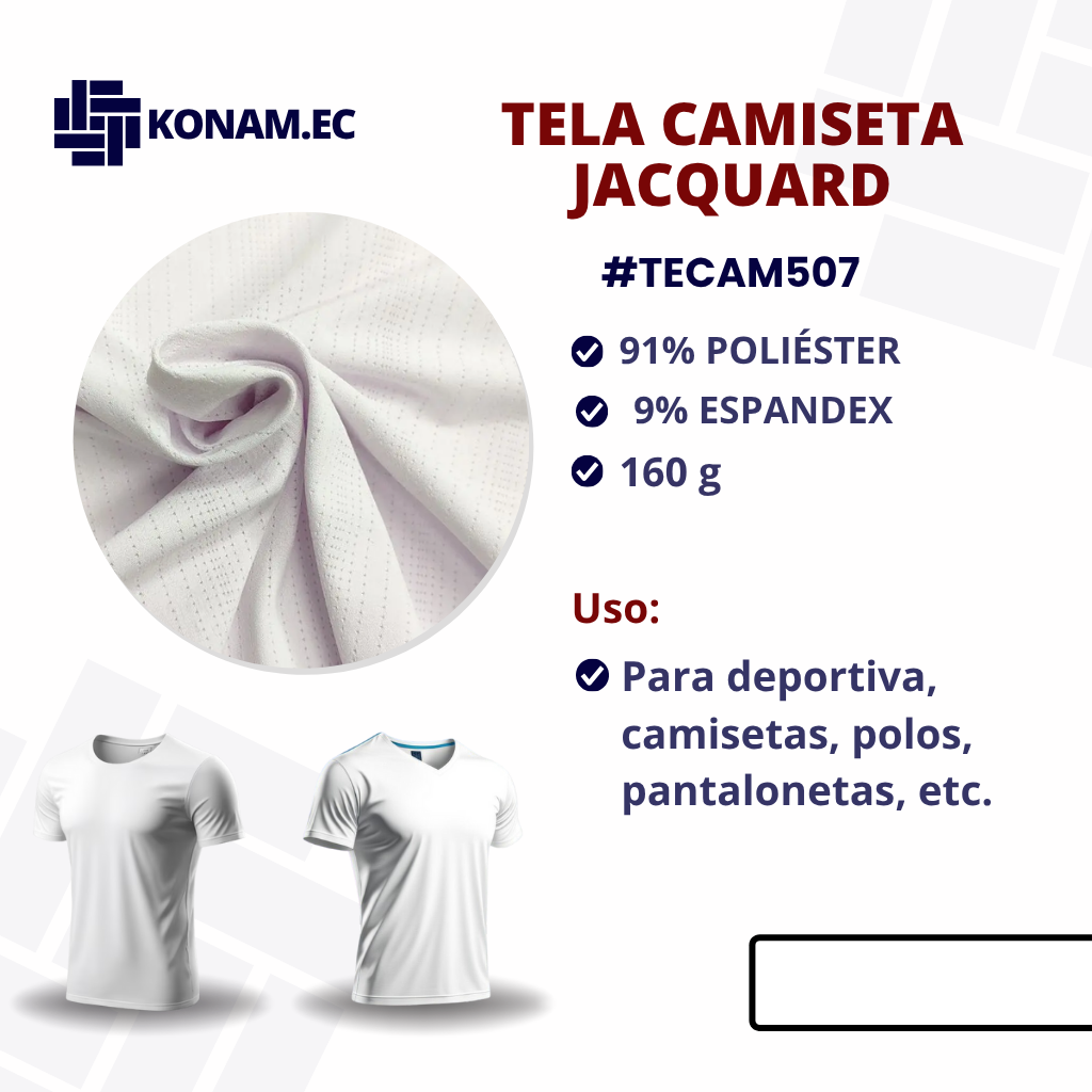 Tela Camiseta Jacquard de 160g, compuesta de 91% poliéster y 9% spandex, con diseño tipo checkered. Ofrece elasticidad, suavidad y una textura jacquard moderna ideal para prendas deportivas de alto rendimiento.