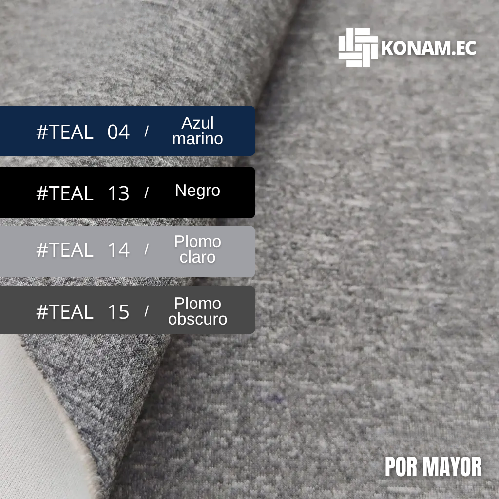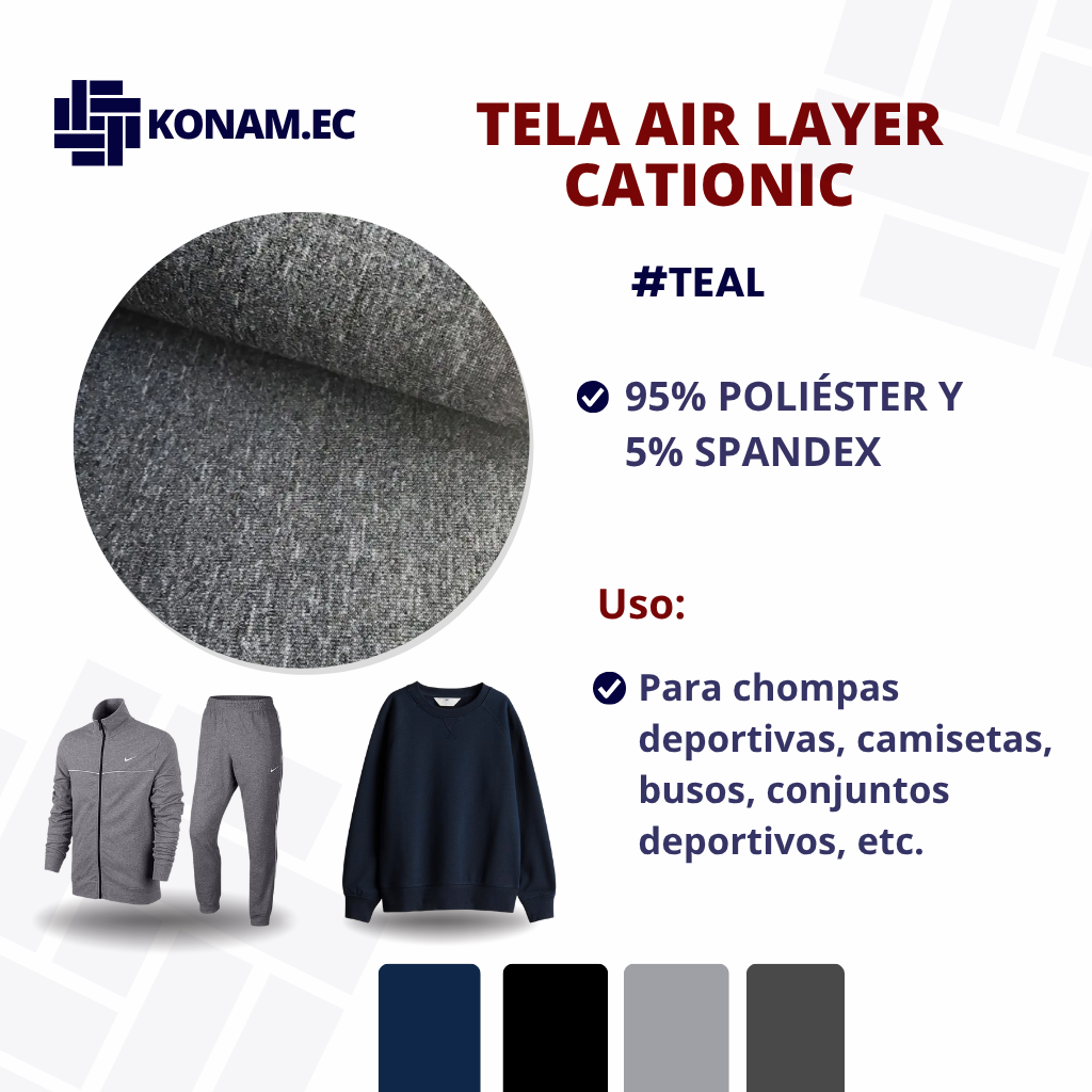 Tela Air Layer Cationic compuesta por 95% poliéster y 5% spandex, disponible al por mayor y menor en colores plomo oscuro, plomo claro, negro y azul marino. Es una tela elástica, cómoda y de excelente recuperación, ideal para confecciones deportivas y casuales.