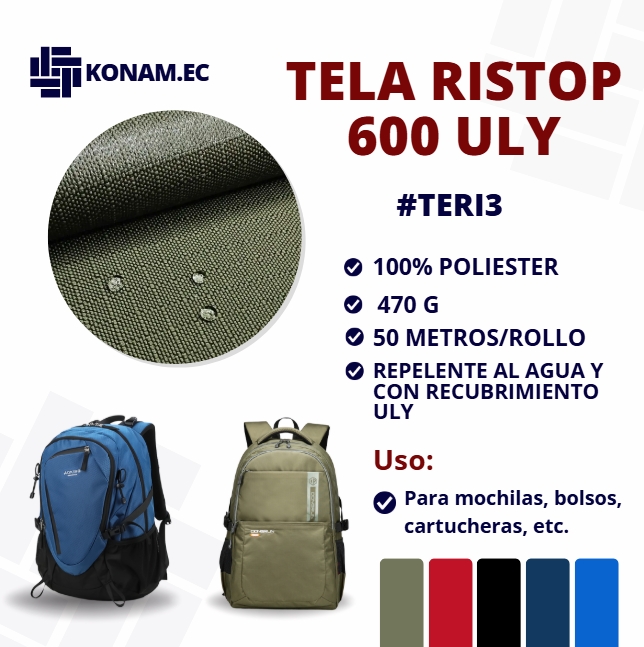 La Tela Ristop 600 ULY está fabricada en 100% poliéster y cuenta con recubrimiento especial ULY, lo que le proporciona alta resistencia al agua, menor contracción y protección UV frente a los rayos del sol. Su estructura tipo ristop brinda mayor durabilidad, firmeza y resistencia al desgaste, siendo ideal para productos de uso exigente.
