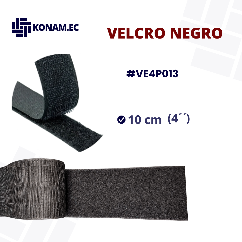 Velcro color negro de 4” (10 cm aprox.) en presentación de rollo, extra resistente y de alta adherencia, ideal para sistemas de ajuste de gran superficie en confecciones textiles. Su ancho amplio brinda máxima firmeza y durabilidad, manteniendo un acabado discreto y profesional.