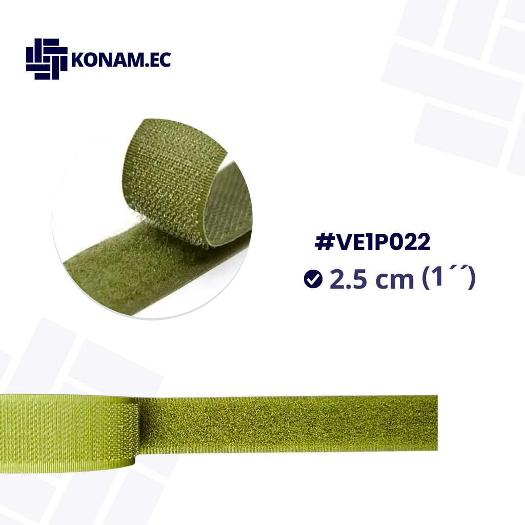 Velcro color verde militar de 2.5 cm aprox. en presentación de rollo, resistente y de excelente adherencia, ideal para sistemas de ajuste práctico y seguro en confecciones textiles. Su color permite integrarse perfectamente en prendas tácticas, deportivas o de trabajo, manteniendo un acabado funcional y profesional.